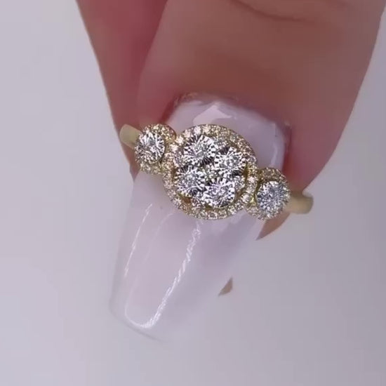 - Genuine Brilliant Cut Round Diamonds are SI clarity and G/H in color at approximately 0.25CT. They are carefully hand set in a 14K Gold high polished cluster three-stone ring setting.